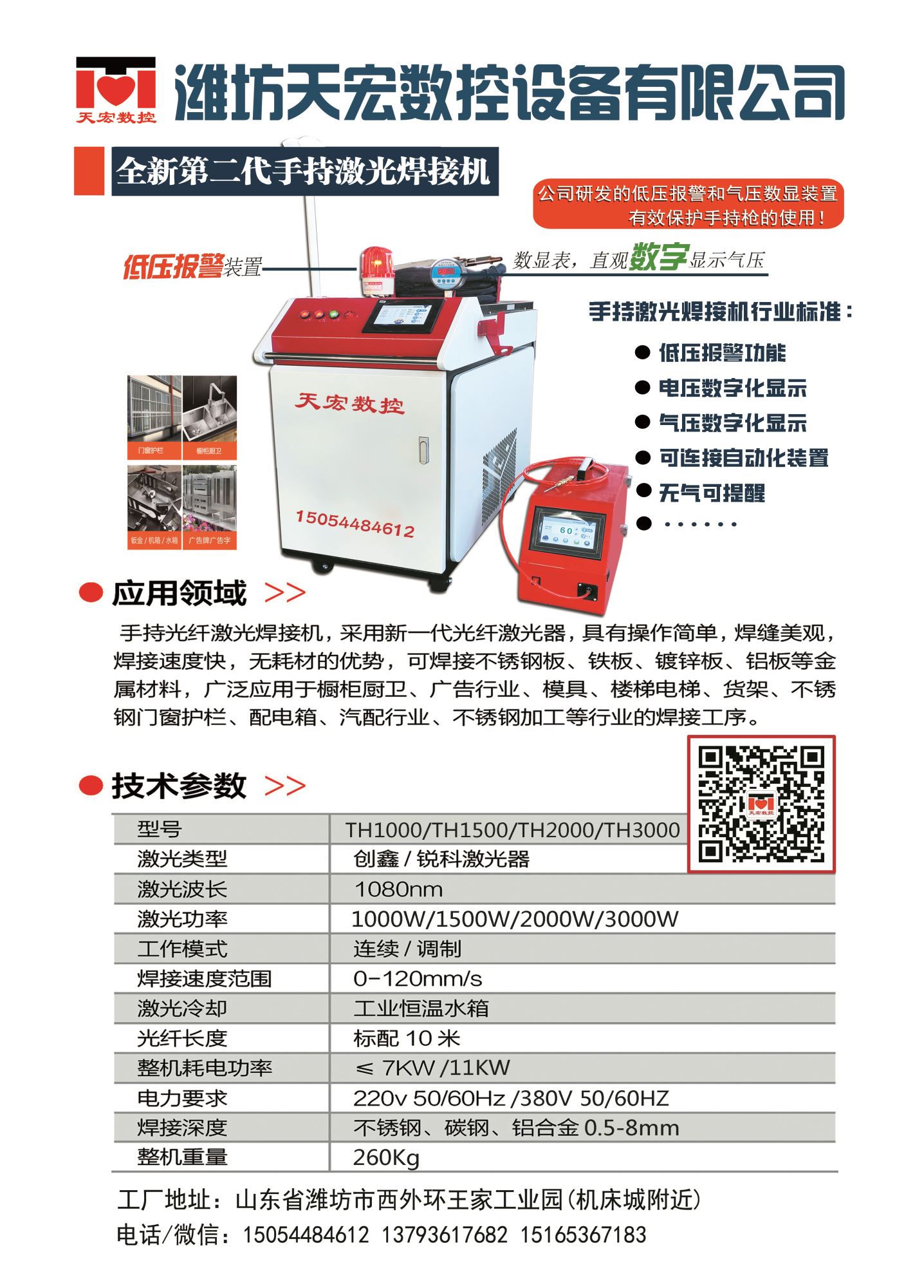 濰坊天宏數控設備有限公司,專業生產手持光纖激光焊接機,配置國內品牌創鑫/銳科激光發生器,超強偉業控制系統和槍頭,大功率雙溫雙控制冷水機,高端配置,品質保證。