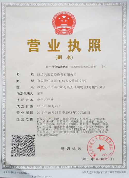 研發(fā)、生產(chǎn)、銷售:自動化設(shè)備、機械沖床、沖床送料機、轉(zhuǎn)塔沖床、數(shù)控沖床、機械設(shè)備、機械手、機器人、等離子切割器、圍字機、開槽機、雕刻機、焊字機、沖孔機、油壓機、激光切割機及配件(以上范圍不含電鍍、鑄造、噴漆);廣告制作(不含固定形式印刷品廣告);進出口貿(mào)易。(依法須經(jīng)批準的項目,經(jīng)相關(guān)部門批準后方可開展經(jīng)營活動)。 |